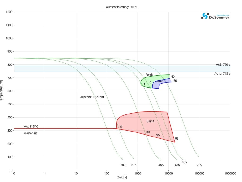 Ce diagramme montre les micro-changements au fil du temps à différentes températures. Ceux-ci sont importants pour le traitement thermique, car ils fournissent des informations sur les conditions optimales pour des processus tels que le durcissement, le recuit et la normalisation.
