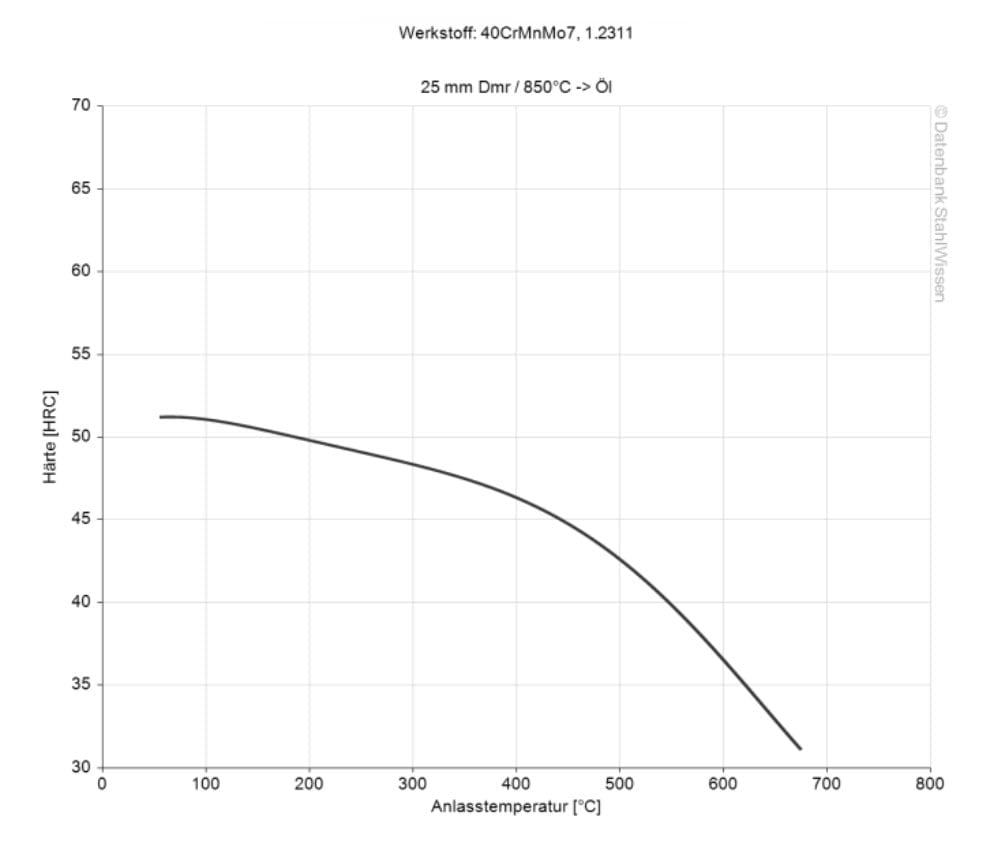 Il a une haute revenue à cœur, garantissant une solidité homogène des pièces. Ce qui est un avantage pour le maintien d’une performance régulière des outils et des moules. Pour obtenir une dureté plus élevée, le 1.2311 (AFNOR 40CMD8) peut être encore trempé, mais son durcissement est limité par rapport à d’autres aciers à outils et il ne convient pas aux applications soumises à des contraintes importamtes.