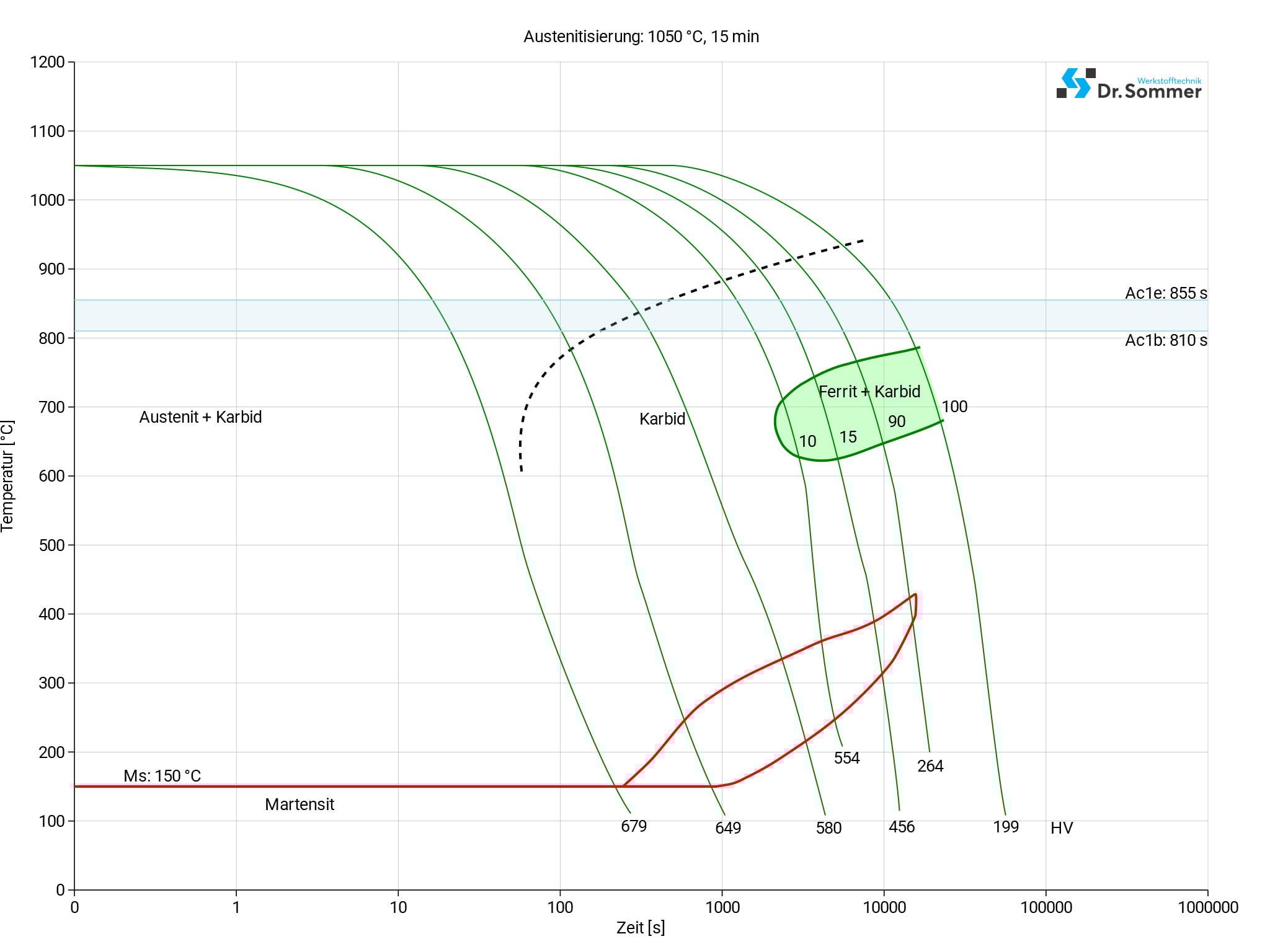 Ce diagramme montre les micro-changements au fil du temps à différentes températures. Ceux-ci sont importants pour le traitement thermique, car ils fournissent des informations sur les conditions optimales pour des processus tels que le durcissement, le recuit et la normalisation.