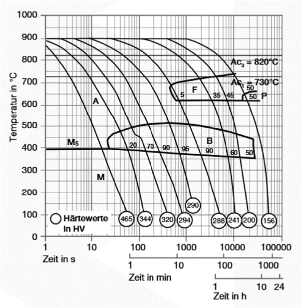 Ce diagramme montre les micro-changements au fil du temps à différentes températures. Ceux-ci sont importants pour le traitement thermique, car ils fournissent des informations sur les conditions optimales pour des processus tels que le durcissement, le recuit et la normalisation.